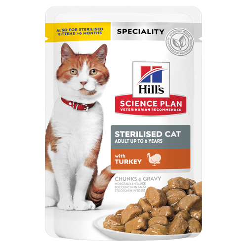 Влажный корм HILL’S SCIENCE PLAN для кастрированных и стерилизованных кошек с нежными кусочками в соусе с индейкой содержит уникальную формулу для контроля веса, которая поддерживает идеальный вес, а также сбалансированный набор минералов для здоровья почек и мочевыводящих путей.